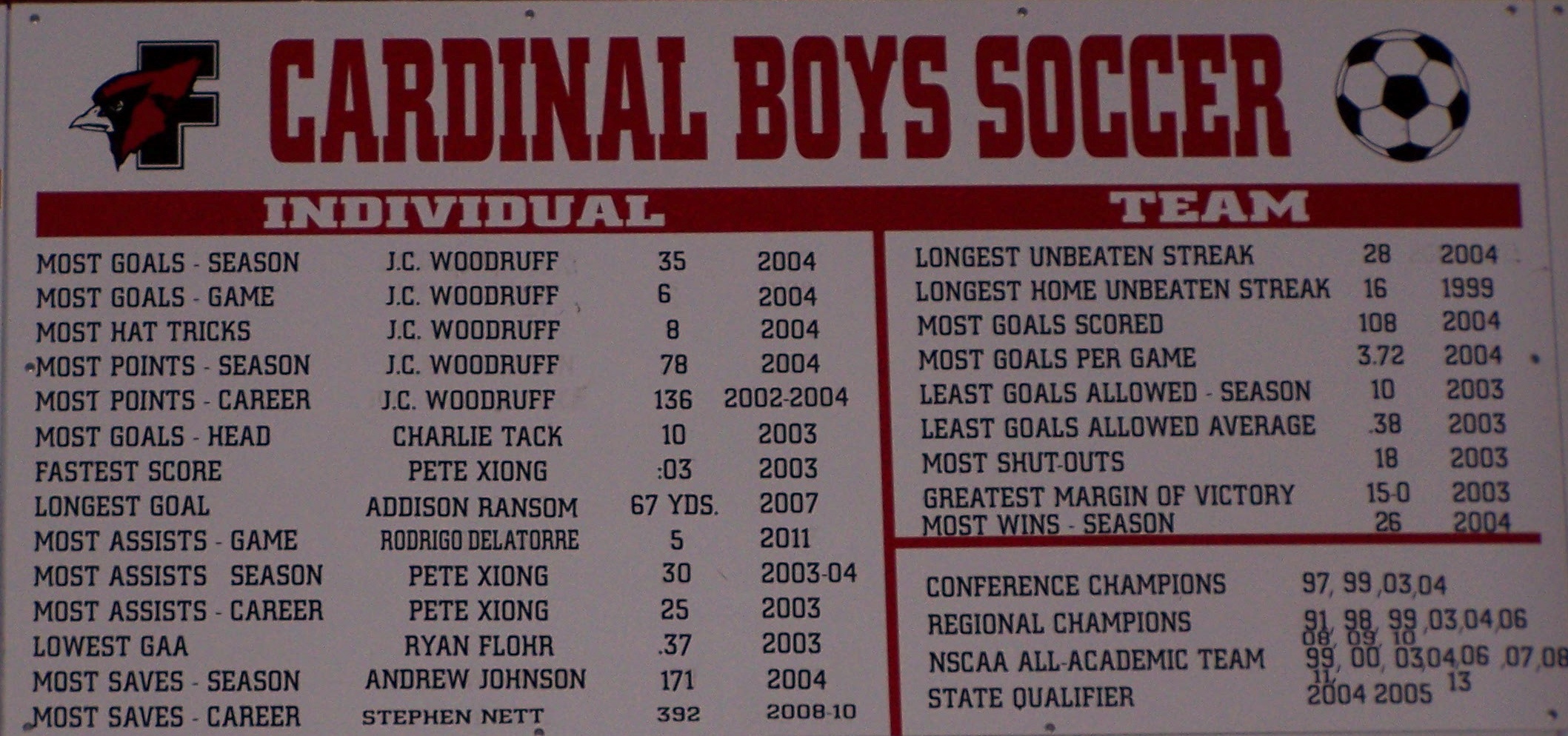 | Most Goals – Season | 35 | JC Woodruff | 2004 |