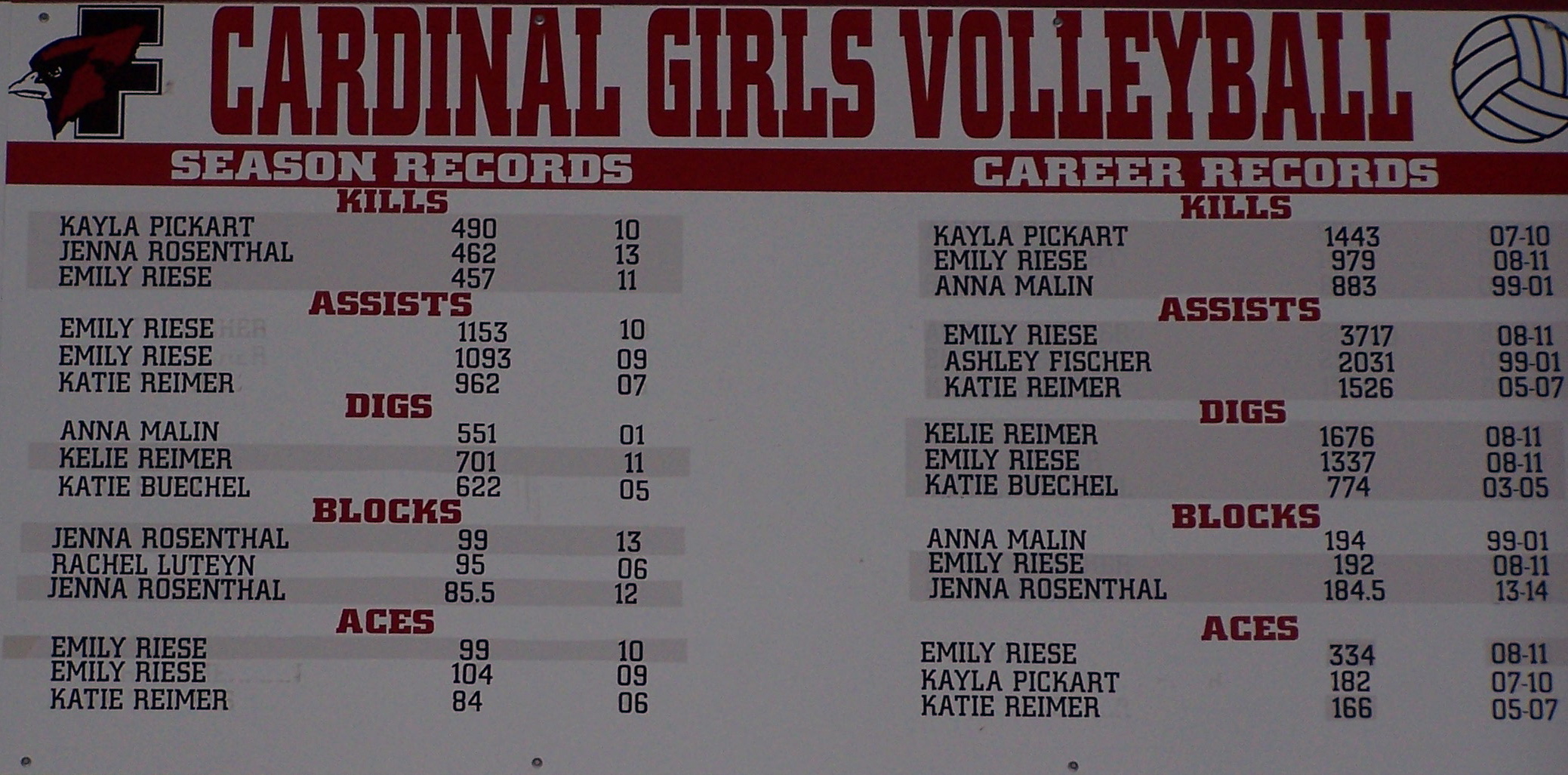 | Jenna Rosenthal | 462 | 2013 | Emily Riese | 979 | 2008-11 |