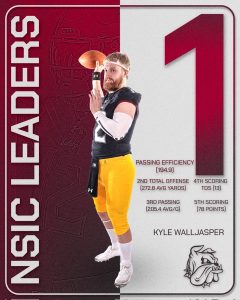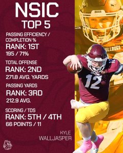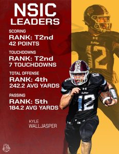 Individually, Kyle Walljasper ranks third in passing yards (203.3 avg/g), first in passing efficiency (178.6), and fourth in scoring (54 points).