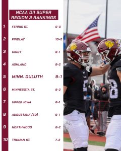 The No. 11 (AFCA) and No. 8 (D2Football.com) University of Minnesota Duluth football team has been ranked fifth in the National Collegiate Athletic Association (NCAA) Division II Super Region Three rankings.